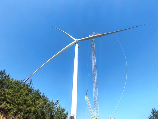 2025年5月13日16時,三都縣周覃廷牌100MW風電場項目首臺風機順利完成吊裝。